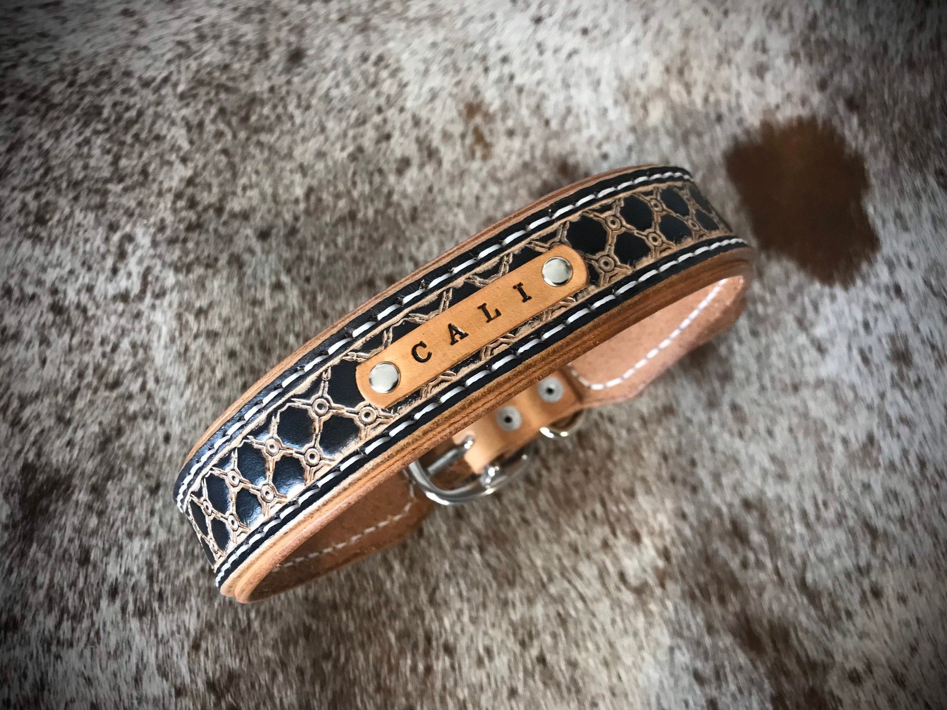 -----ITEM DESCRIPTION----- This durable, personalized and measured to order leather collar is made of genuine leather and I hand tool and dye to make it extra special for you and your pets! Different colours and design can be requested and I will be happy to make it for you. If you would like name, initials, please let me know!!