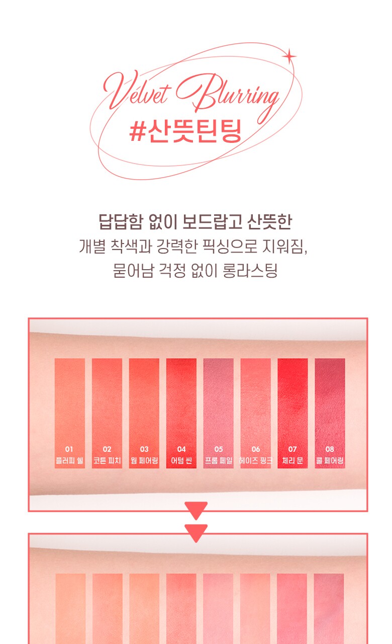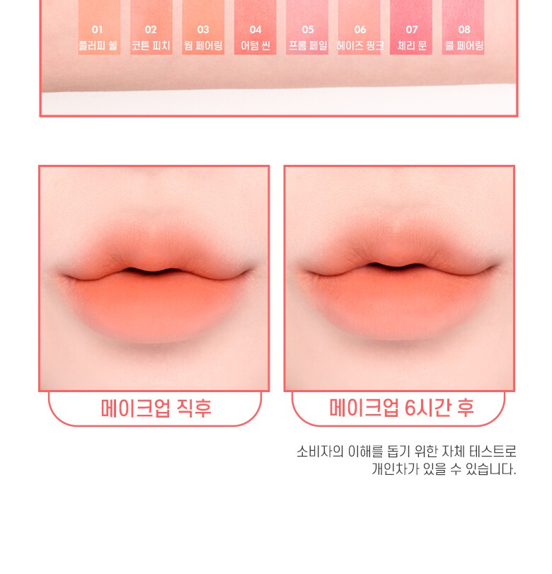 - Moisturizing melting velvet texture covers the keratin smoothly and adheres to the lips refreshingly without any slippery or dryness.
