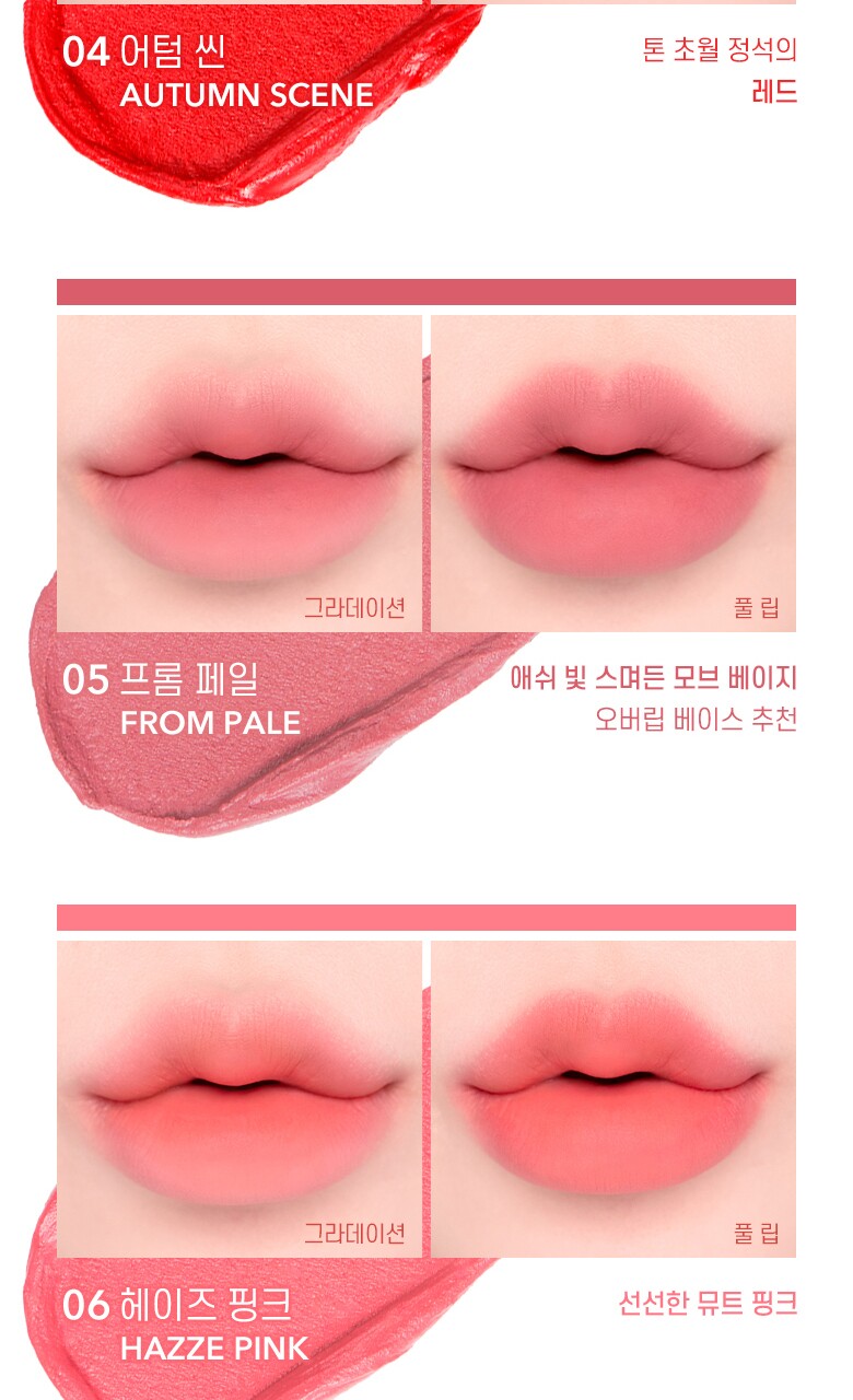 Ingredients | [01 FLUFFY SHELL] Dimethicone, Dimethicone Crosspolymer, Polyglyceryl-2 Triisostearate, Isododecane, Water, Titanium Dioxide, Mica, Silica, Dimethicone/Vinyl Dimethicone Crosspolymer, Trimethylsiloxysilicate, Pentylene Glycol, Sorbitan Isostearate, Lauryl PEG-10 Tris(Trimethylsiloxy)silylethyl Dimethicone, Iron Oxide Red, Sunset Yellow FCF, Polypropylsilsesquioxane, Disteardimonium Hectorite, Polyglyceryl-10 Laurate, Phenoxyethanol, Sodium Polyacrylate, Butylene Glycol, Propylene Carbonate, Methicone, Iron Oxide Black, Fragrance, Triethoxycaprylylsilane, Aluminum Hydroxide, Ethylhexylglycerin, Cyclopentasiloxane, PEG-10, Phloxine B, PEG/PPG-18/18 Dimethicone, Trideceth-6, Fast Acid Magenta, Tartrazine, Arginine, Carbomer, Cocos Nucifera (Coconut) Oil, 1,2-Hexanediol, Aloe Barbadensis Leaf Extract, Sodium Hyaluronate, Hydroxypropyltrimonium Hyaluronate, Hydrolyzed Hyaluronic Acid, Sodium Acetylated Hyaluronate, Hyaluronic Acid, Hydrolyzed Sodium Hyaluronate, Sodium Hyaluronate Crosspolymer, Potassium Hyaluronate [02 COTTON PEACH] Dimethicone, Dimethicone Crosspolymer, Polyglyceryl-2 Triisostearate, Isododecane, Water, Mica, Silica, Titanium Dioxide, Dimethicone/Vinyl Dimethicone Crosspolymer, Trimethylsiloxysilicate, Pentylene Glycol, Sorbitan Isostearate, Lauryl PEG-10 Tris(Trimethylsiloxy)silylethyl Dimethicone, Tartrazine, Polypropylsilsesquioxane, Sunset Yellow FCF, Disteardimonium Hectorite, Polyglyceryl-10 Laurate, Phenoxyethanol, Sodium Polyacrylate, Lithol Rubine BCA, Butylene Glycol, Propylene Carbonate, Methicone, Fragrance, Iron Oxide Black, Ethylhexylglycerin, Cyclopentasiloxane, PEG-10, Triethoxycaprylylsilane, Aluminum Hydroxide, PEG/PPG-18/18 Dimethicone, Trideceth-6, Fast Acid Magenta, Arginine, Carbomer, Cocos Nucifera (Coconut) Oil, 1,2-Hexanediol, Aloe Barbadensis Leaf Extract, Sodium Hyaluronate, Hydroxypropyltrimonium Hyaluronate, Hydrolyzed Hyaluronic Acid, Sodium Acetylated Hyaluronate, Hyaluronic Acid, Hydrolyzed Sodium Hyaluronate, Sodium Hyaluronate Crosspolymer, Potassium Hyaluronate [03 WARM PAIRING] Dimethicone, Dimethicone Crosspolymer, Isododecane, Polyglyceryl-2 Triisostearate, Water, Mica, Silica, Titanium Dioxide, Iron Oxide Red, Dimethicone/Vinyl Dimethicone Crosspolymer, Trimethylsiloxysilicate, Pentylene Glycol, Sorbitan Isostearate, Lauryl PEG-10 Tris(Trimethylsiloxy)silylethyl Dimethicone, Polypropylsilsesquioxane, Disteardimonium Hectorite, Polyglyceryl-10 Laurate, Sunset Yellow FCF, Phenoxyethanol, Sodium Polyacrylate, Butylene Glycol, Lithol Rubine BCA, Propylene Carbonate, Methicone, Fragrance, Triethoxycaprylylsilane, Ethylhexylglycerin, Cyclopentasiloxane, PEG-10, Aluminum Hydroxide, PEG/PPG-18/18 Dimethicone, Trideceth-6, Fast Acid Magenta, Arginine, Carbomer, Cocos Nucifera (Coconut) Oil, 1,2-Hexanediol, Aloe Barbadensis Leaf Extract, Sodium Hyaluronate, Hydroxypropyltrimonium Hyaluronate, Hydrolyzed Hyaluronic Acid, Sodium Acetylated Hyaluronate, Hyaluronic Acid, Hydrolyzed Sodium Hyaluronate, Sodium Hyaluronate Crosspolymer, Potassium Hyaluronate [04 AWESOME SCENE] Dimethicone, Dimethicone Crosspolymer, Polyglyceryl-2 Triisostearate, Isododecane, Water, Mica, Silica, Iron Oxide Red, Dimethicone/Vinyl Dimethicone Crosspolymer, Trimethylsiloxysilicate, Pentylene Glycol, Sorbitan Isostearate, Lauryl PEG-10 Tris(Trimethylsiloxy)silylethyl Dimethicone, Lithol Rubine BCA, Polypropylsilsesquioxane, Disteardimonium Hectorite, Polyglyceryl-10 Laurate, Phenoxyethanol, Sodium Polyacrylate, Butylene Glycol, Propylene Carbonate, Methicone, Fragrance, Titanium Dioxide, Sunset Yellow FCF, Ethylhexylglycerin, Triethoxycaprylylsilane, Cyclopentasiloxane, PEG-10, PEG/PPG-18/18 Dimethicone, Trideceth-6, Fast Acid Magenta, Sunset Yellow FCF, Arginine, Carbomer, Aluminum Hydroxide, Cocos Nucifera (Coconut) Oil, 1,2-Hexanediol, Aloe Barbadensis Leaf Extract, Sodium Hyaluronate, Hydroxypropyltrimonium Hyaluronate, Hydrolyzed Hyaluronic Acid, Sodium Acetylated Hyaluronate, Hyaluronic Acid, Hydrolyzed Sodium Hyaluronate, Sodium Hyaluronate Crosspolymer, Potassium Hyaluronate [05 FROM PALE] Dimethicone, Dimethicone Crosspolymer, Polyglyceryl-2 Triisostearate, Isododecane, Water, Mica, Titanium Dioxide, Silica, Dimethicone/Vinyl Dimethicone Crosspolymer, Iron Oxide Yellow, Trimethylsiloxysilicate, Pentylene Glycol, Sorbitan Isostearate, Lauryl PEG-10 Tris(Trimethylsiloxy)silylethyl Dimethicone, Polypropylsilsesquioxane, Disteardimonium Hectorite, Polyglyceryl-10 Laurate, Lithol Rubine BCA, Phenoxyethanol, Sodium Polyacrylate, Butylene Glycol, Phloxine B, Propylene Carbonate, Methicone, Iron Oxide Black, Fragrance, Triethoxycaprylylsilane, Brilliant Blue FCF, Ethylhexylglycerin, Cyclopentasiloxane, PEG-10, Aluminum Hydroxide, PEG/PPG-18/18 Dimethicone, Trideceth-6, Tartrazine, Arginine, Carbomer, Fast Acid Magenta, Cocos Nucifera (Coconut) Oil, 1,2-Hexanediol, Aloe Barbadensis Leaf Extract, Sodium Hyaluronate, Hydroxypropyltrimonium Hyaluronate, Hydrolyzed Hyaluronic Acid, Sodium Acetylated Hyaluronate, Hyaluronic Acid, Hydrolyzed Sodium Hyaluronate, Sodium Hyaluronate Crosspolymer, Potassium Hyaluronate [06 HAZE PINK] Dimethicone, Dimethicone Crosspolymer, Isododecane, Water, Polyglyceryl-2 Triisostearate, Mica, Silica, Dimethicone/Vinyl Dimethicone Crosspolymer, Titanium Dioxide, Trimethylsiloxysilicate, Pentylene Glycol, Sorbitan Isostearate, Lauryl PEG-10 Tris(Trimethylsiloxy)silylethyl Dimethicone, Tartrazine, Polypropylsilsesquioxane, Polyglyceryl-10 Laurate, Disteardimonium Hectorite, Phenoxyethanol, Butylene Glycol, Sodium Polyacrylate, Lithol Rubine BCA, Propylene Carbonate, Iron Oxide Red, Methicone, Fragrance, Ethylhexylglycerin, Cyclopentasiloxane, PEG-10, Triethoxycaprylylsilane, Aluminum Hydroxide, PEG/PPG-18/18 Dimethicone, Trideceth-6, Iron Oxide Black, Fast Acid Magenta, Arginine, Carbomer, Cocos Nucifera (Coconut) Oil, 1,2-Hexanediol, Aloe Barbadensis Leaf Extract, Sodium Hyaluronate, Hydroxypropyltrimonium Hyaluronate, Hydrolyzed Hyalu