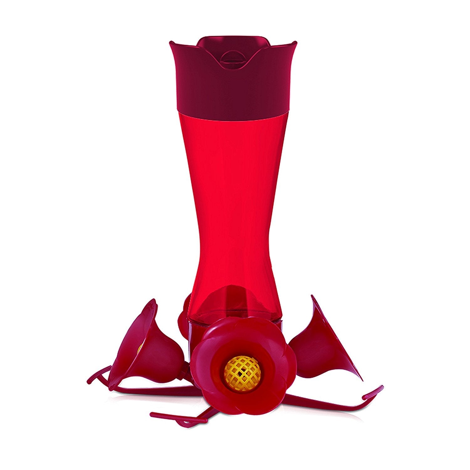 - The Perky-Pet Pinch-Waist Red Glass Hummingbird Feeder boasts four ports with perches. The vibrant red color and flower-shaped ports are perfect for attracting hummers, while the number of ports ensures there’s enough room for multiple birds to dine simultaneously.