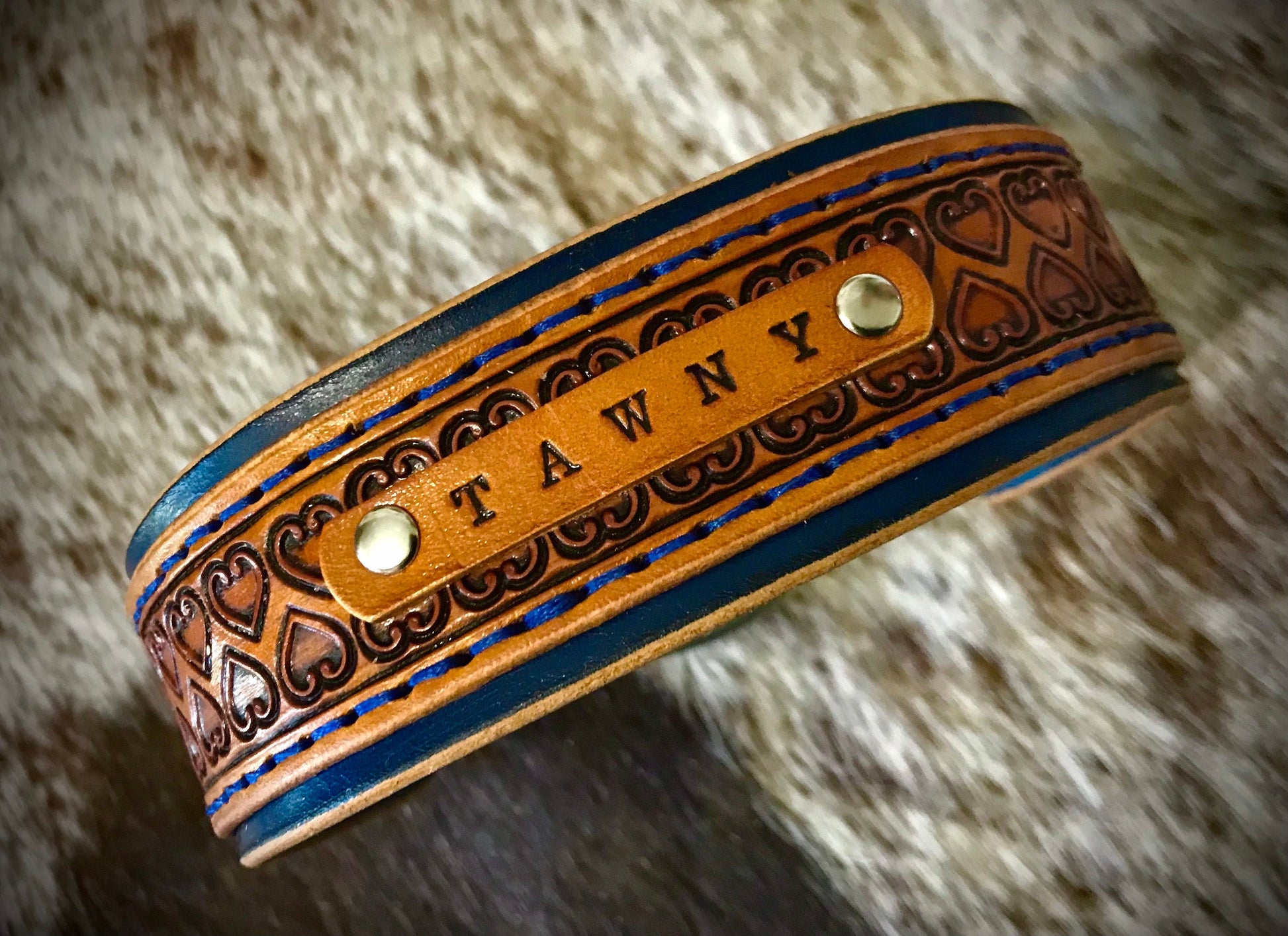 -----ITEM DESCRIPTION----- This durable, personalized and measured to order leather collar is made of genuine leather and I hand tool and dye to make it extra special for you and your pets! Different colours and design can be requested and I will be happy to make it for you. If you would like name, initials, please let me know!!